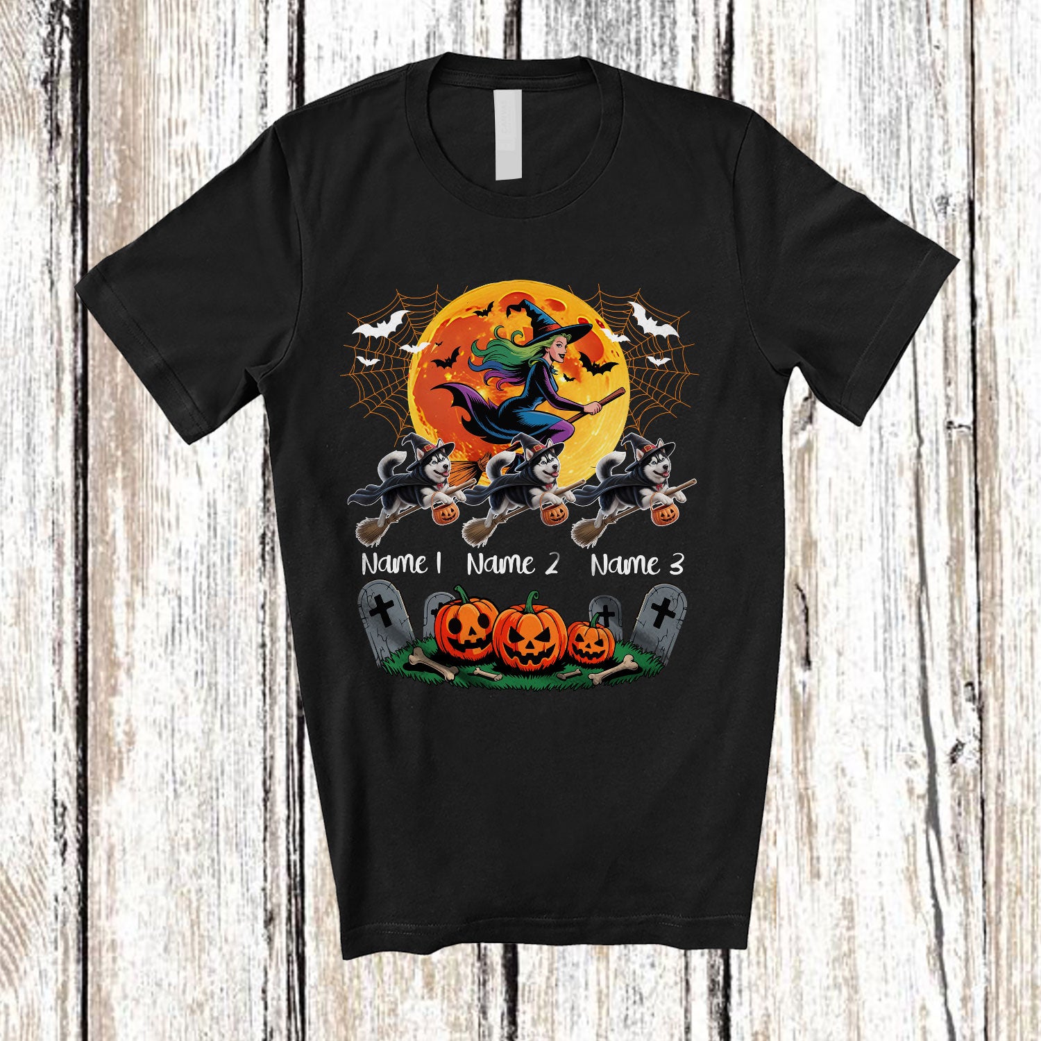 Personalized Custom Name Three Witch Husky Owner; Creepy Halloween Moon; Family Group T-Shirt. This cotton t-shirt is a durable staple product with a classic fit. One of the most popular items, it has a relaxed style made for everyday and casual wear.