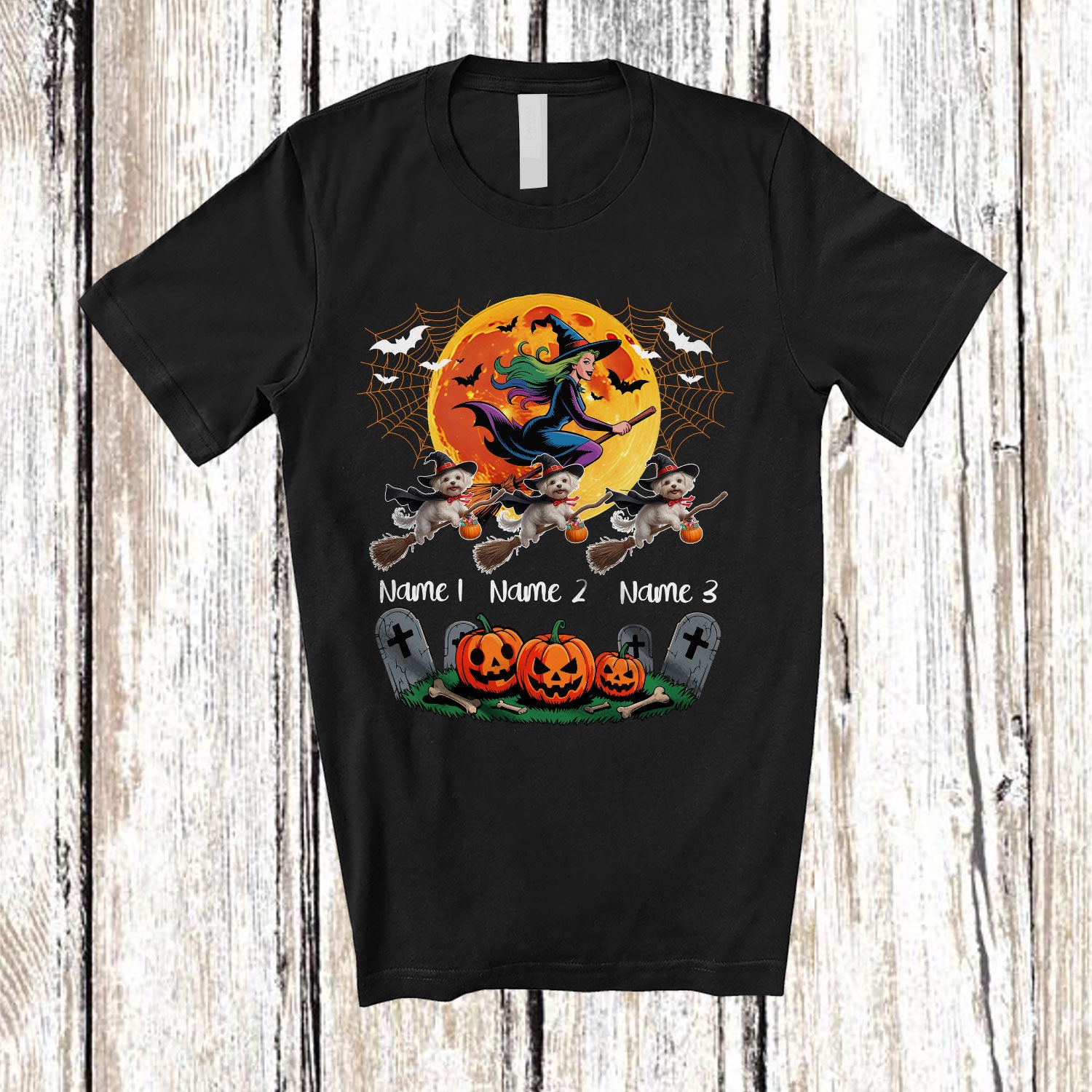 The Personalized Custom Name Three Witch Maltese Owner; Creepy Halloween Moon; Family Group T-Shirt is far and away, one of our most popular items. People can't seem to get enough of it.