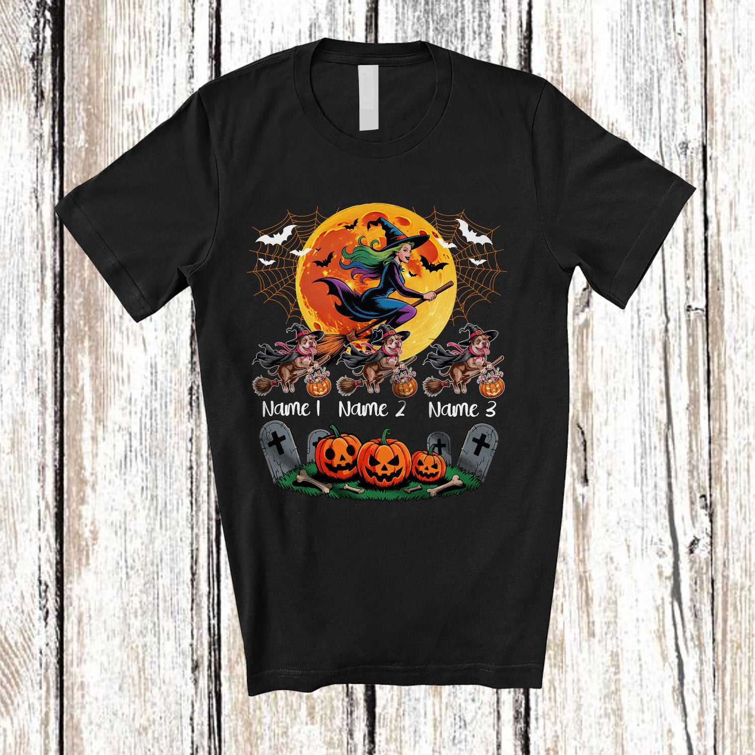 Personalized Custom Name Three Witch Pit Bull Owner; Creepy Halloween Moon; Family Group T-Shirt. This cotton t-shirt is a durable staple product with a classic fit. One of the most popular items, it has a relaxed style made for everyday and casual wear.