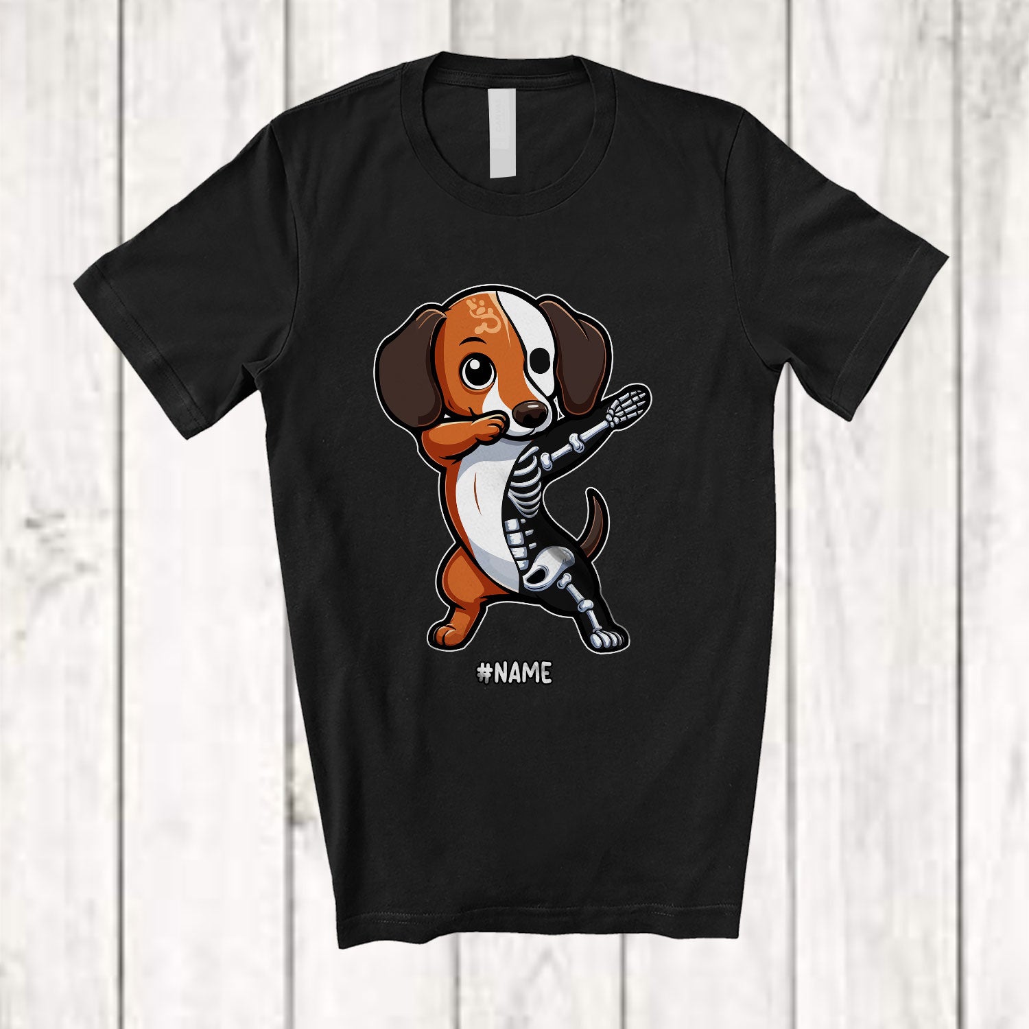 • Personalized Dabbing Dachshund Skeleton; Joyful Halloween Custom Name Owner Family Group T-Shirt. This cotton t-shirt is a durable staple product with a classic fit. One of the most popular items, it has a relaxed style made for everyday and casual wear.