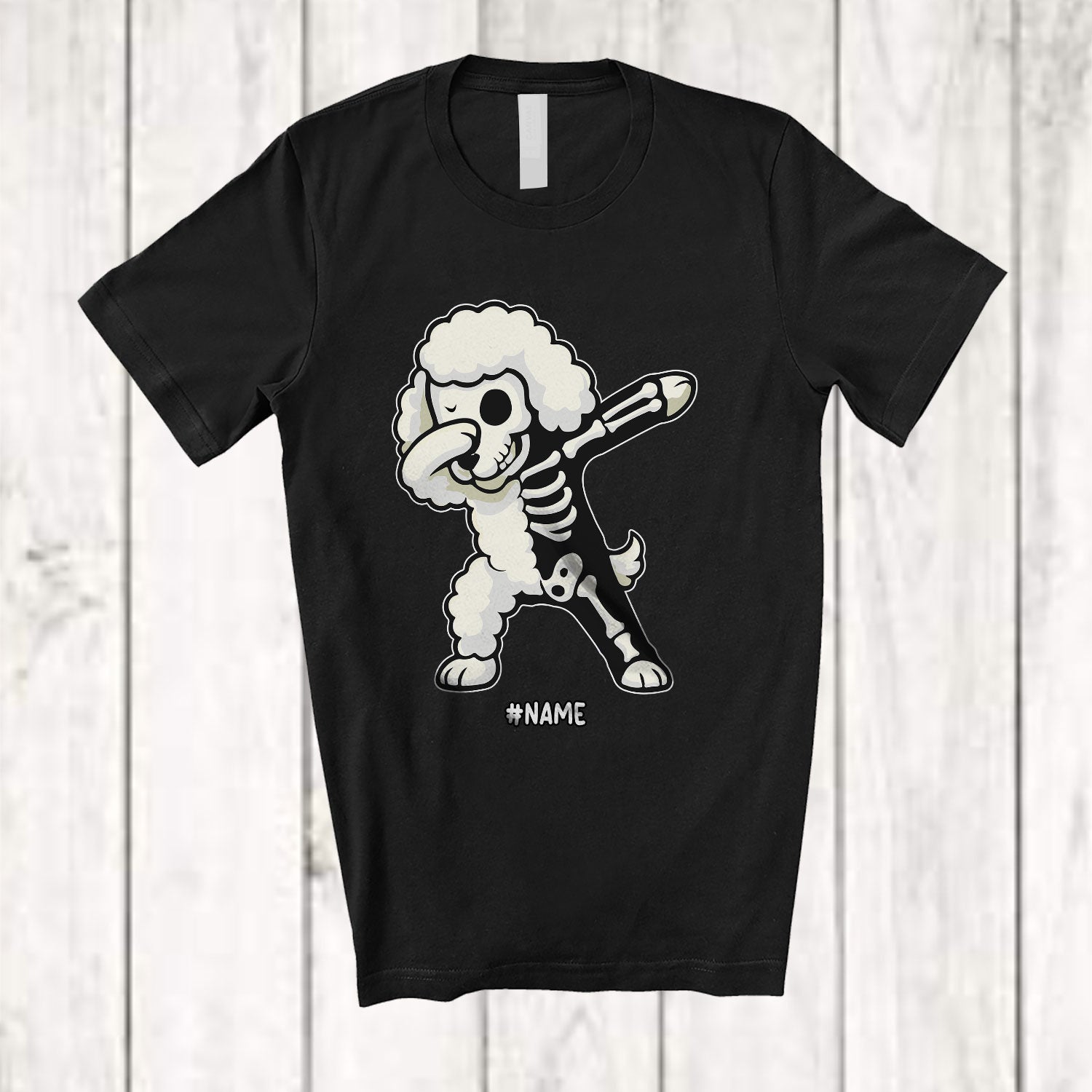 • Personalized Dabbing Poodle Skeleton; Joyful Halloween Custom Name Owner Family Group T-Shirt. This cotton t-shirt is a durable staple product with a classic fit. One of the most popular items, it has a relaxed style made for everyday and casual wear.