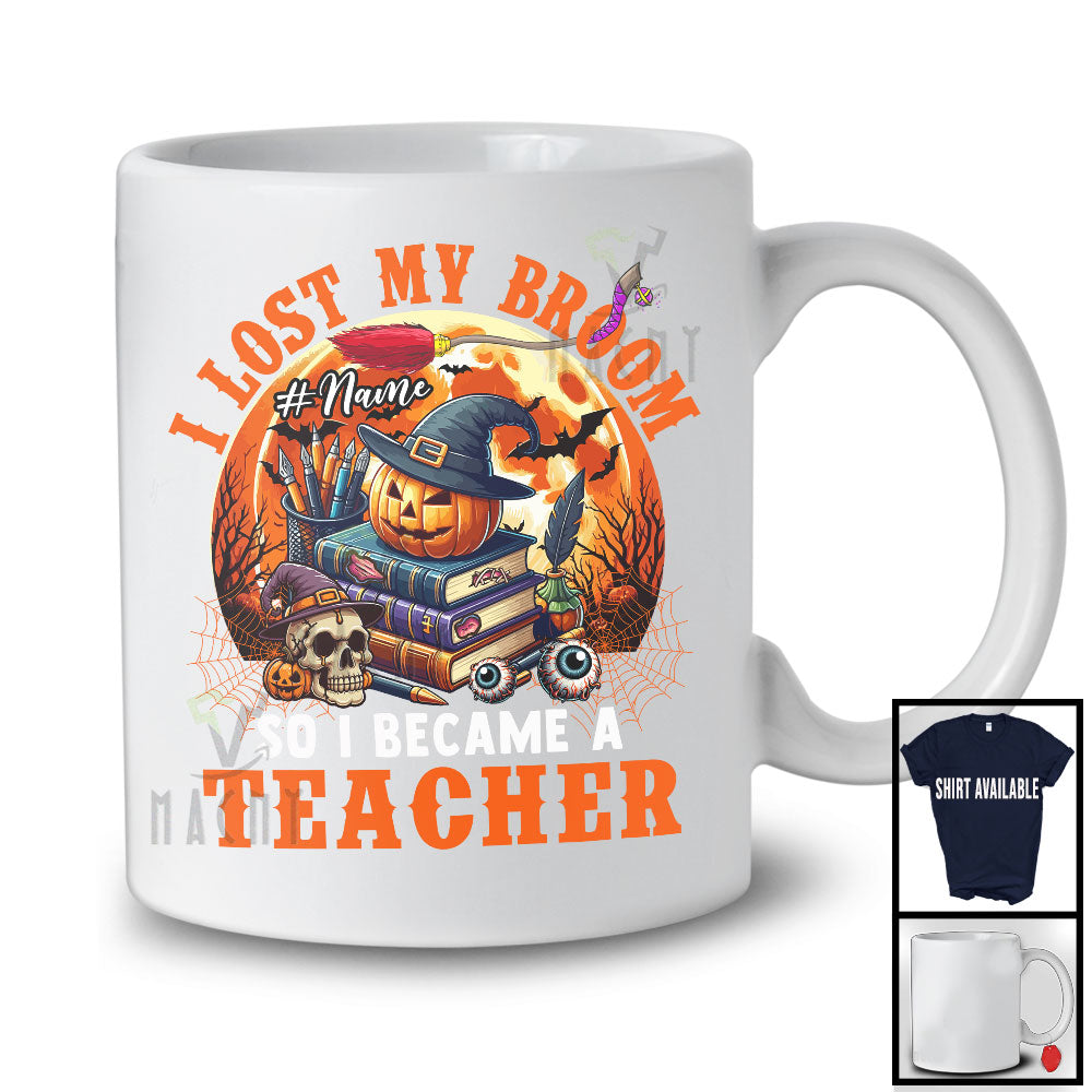 Personalized I Lost My Broom I Became A Teacher; Scary Halloween Custom Name Jobs T-Shirt. This cotton t-shirt is a durable staple product with a classic fit. One of the most popular items, it has a relaxed style made for everyday and casual wear.
