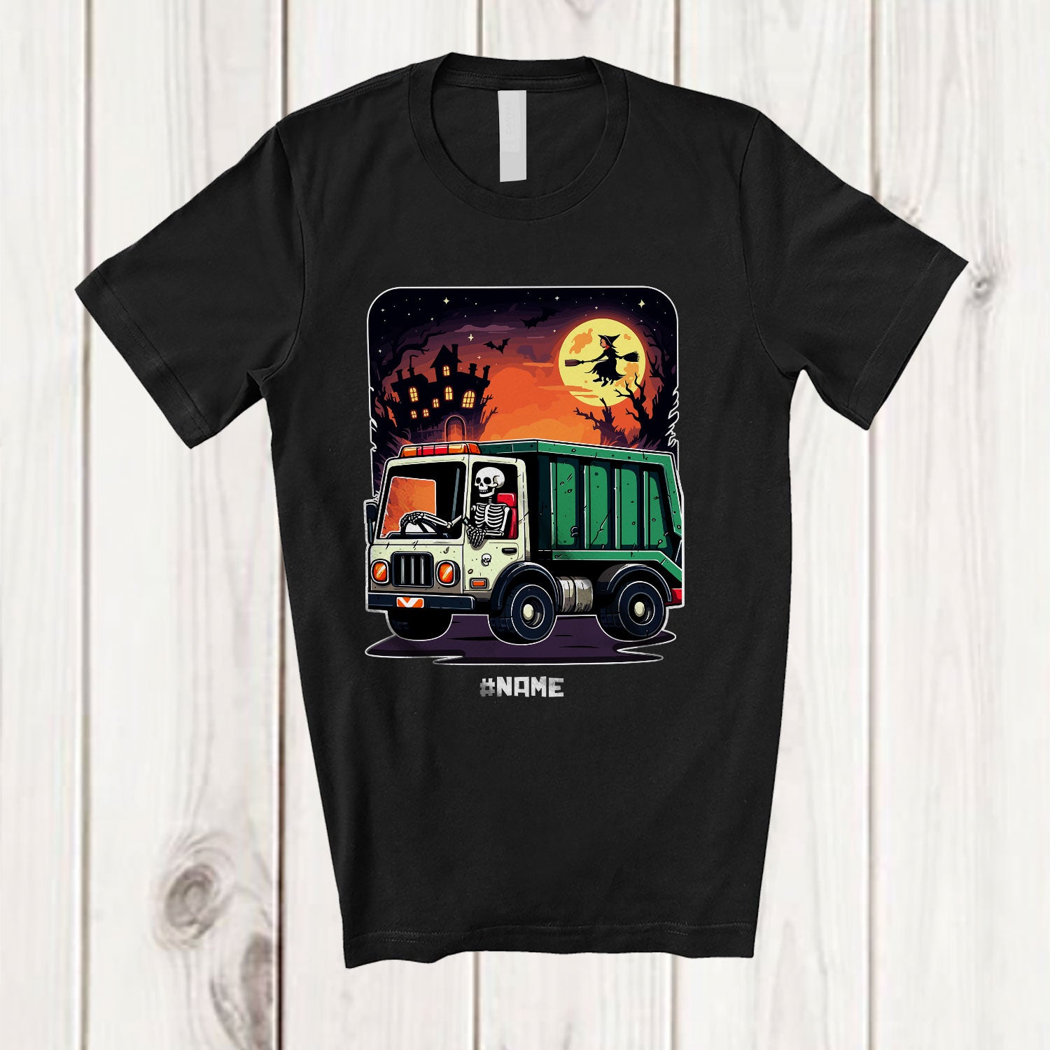 Personalized Vintage Skeleton Driving Garbage Truck; Awesome Halloween Custom Name Driver T-Shirt