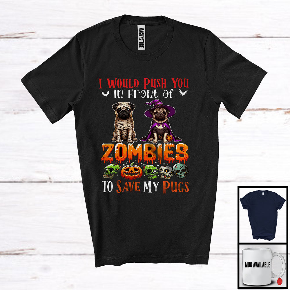 The Push You Front of Zombies, Horror Halloween Costume Witch Mummy Pugs Owner, Family Group T-Shirt destined to impress, and priced at only $12.95, for a limited time.
