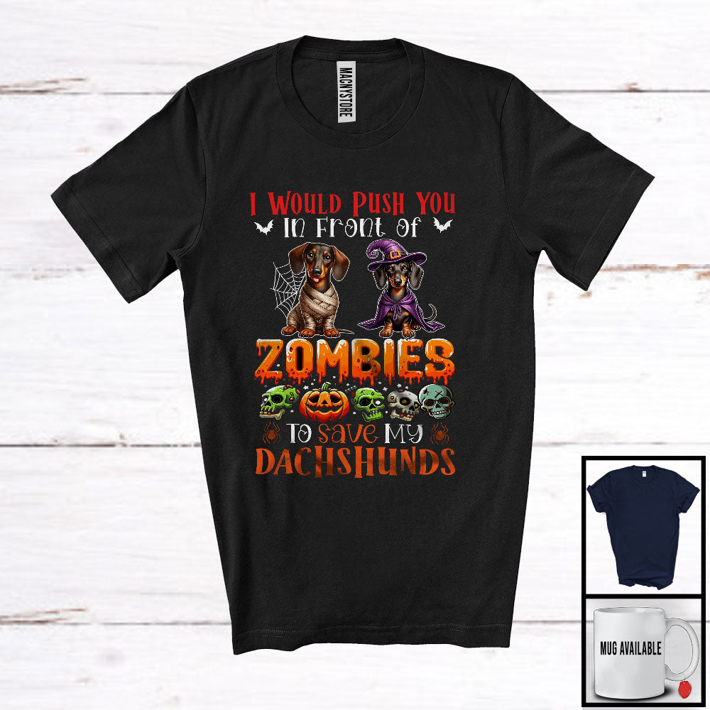 This Push You Front of Zombies, Horror Halloween Witch Mummy Dachshunds Owner, Family Group T-Shirt is great idea gift for your family, friends in this birthday, christmas, mother's day, father's day, patrick's day or any holiday.