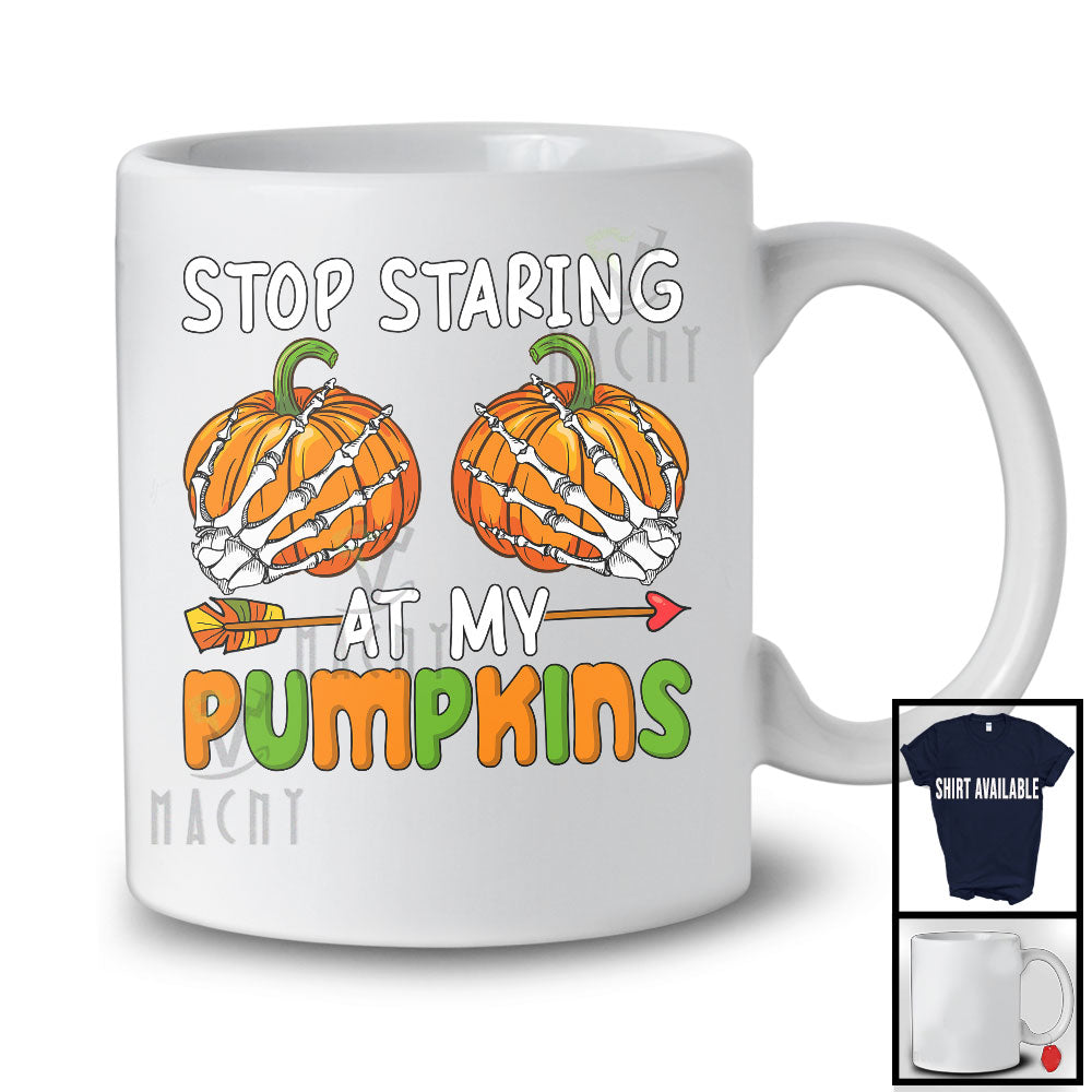 Stop Staring At My Pumpkins, Awesome Halloween Two Pumpkin Boobs Skeleton Hands, Family T-Shirt. This cotton t-shirt is a durable staple product with a classic fit. One of the most popular items, it has a relaxed style made for everyday and casual wear.