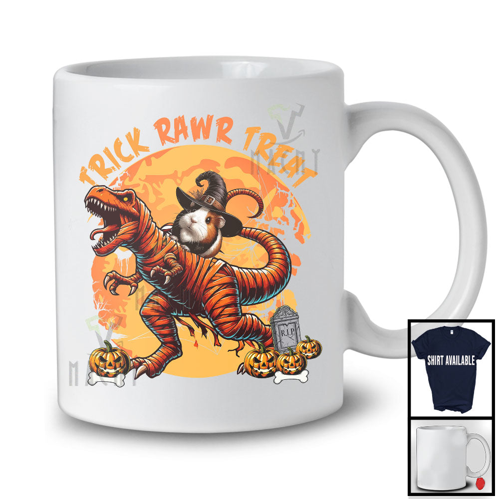 Trick Rawr Treat; Horror Halloween Witch Guinea Pig Riding Mummy T-Rex; Dinosaur Lover T-Shirt. This cotton t-shirt is a durable staple product with a classic fit. One of the most popular items, it has a relaxed style made for everyday and casual wear.