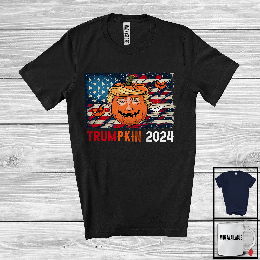 • Trumpkin 2024; Sarcastic Halloween Pumpkin Trump Face; America Flag President Vote Election T-Shirt. This cotton t-shirt is a durable staple product with a classic fit. One of the most popular items, it has a relaxed style made for everyday and casual wear.
