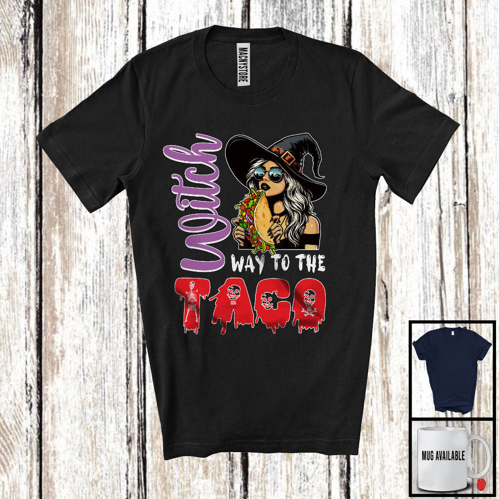 Witch Way To The Taco; Sarcastic Halloween Witch Sunglasses; Eating Taco T-Shirt. This cotton t-shirt is a durable staple product with a classic fit. One of the most popular items, it has a relaxed style made for everyday and casual wear.