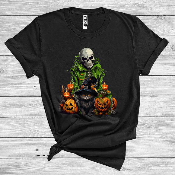 Skeleton With Cat Witch Scary Skull Carved Pumpkins Halloween Costume T-Shirt