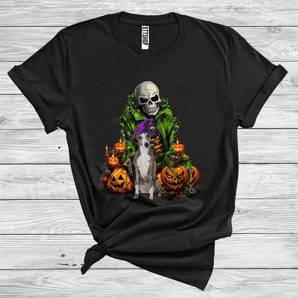 Skeleton With Whippet Witch Scary Skull Carved Pumpkins Halloween Costume T-Shirt