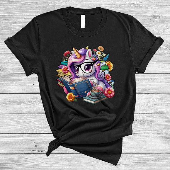 Unicorn Drinking Coffee And Reading Book, Cute Teacher Librarian, Flowers Floral Book Nerd T-Shirt
