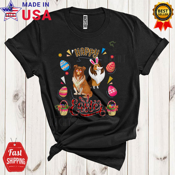 Happy Easter Cute Funny Easter Day Leopard Plaid Eggs Hunt Couple Bunny Shetland Sheepdog Dog T-Shirt