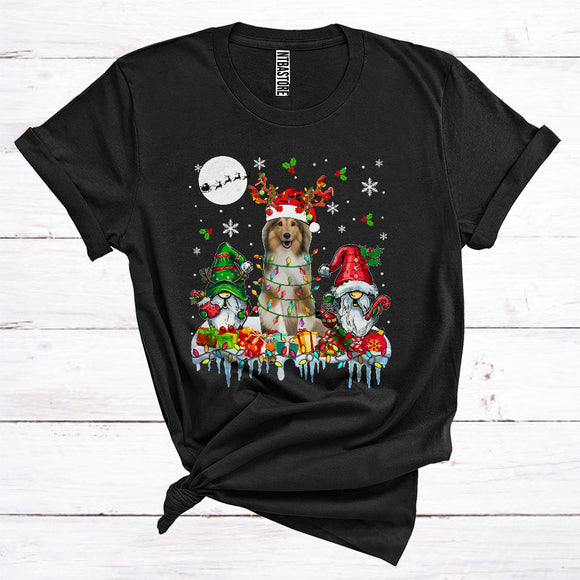 Santa Reindeer Shetland Sheepdog With Gnomes Cute Christmas Lights Animal Owner T-Shirt