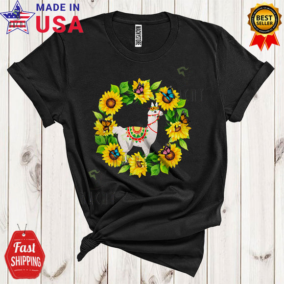 Cute Llama In Sunflowers Circle Cool Funny Animal Butterfly Gardener Farm Farmer T-Shirt