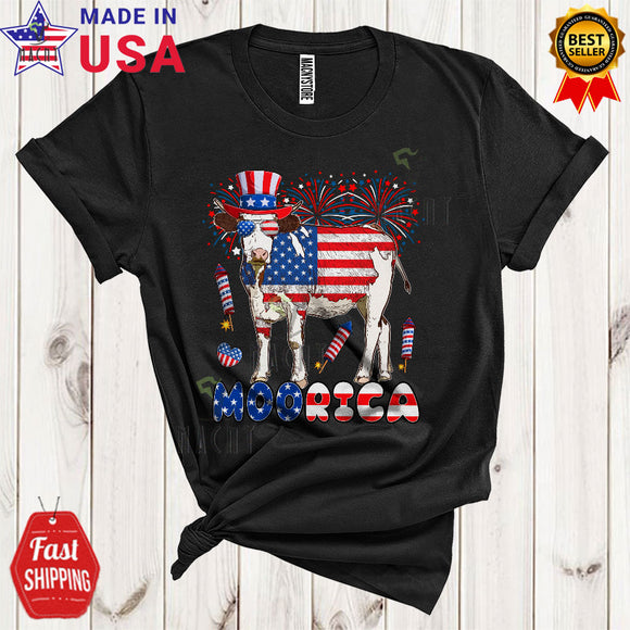 Moorica Cool Cute 4th Of July Halloween Cows Farmer US Flag Fireworks Proud Patriotic T-Shirt