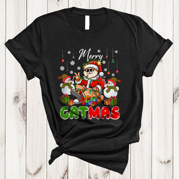 Merry Catmas, Joyful Christmas Santa Kitten Snowman, Matching X-mas Pajama Group T-Shirt