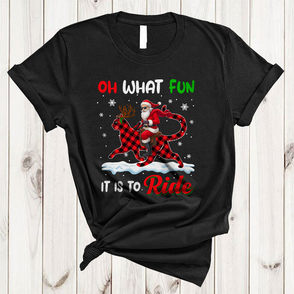 Oh What Fun It Is To Ride, Awesome Santa Riding Cat Red Plaid Reindeer, X-mas Animal T-Shirt