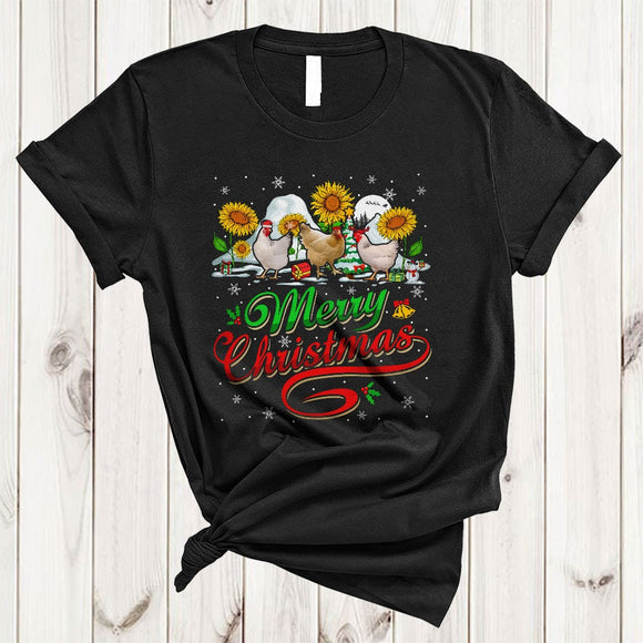 Merry Christmas, Cool Lovely Three Chickens With Sunflower, Snow Around Farm Farmer X-mas T-Shirt