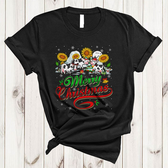 Merry Christmas, Cool Lovely Three Cows With Sunflower, Snow Around Farm Farmer X-mas T-Shirt