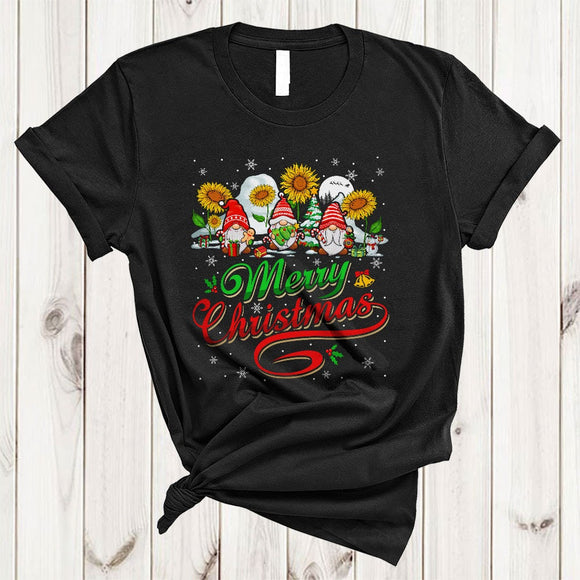 Merry Christmas, Cool Lovely Three Gnomes With Sunflower, Snow Around Farm Farmer X-mas T-Shirt