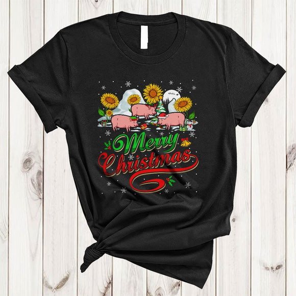 Merry Christmas, Cool Lovely Three Pigs With Sunflower, Snow Around Farm Farmer X-mas T-Shirt