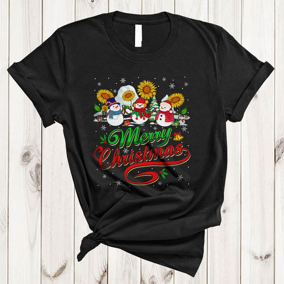 Merry Christmas, Cool Lovely Three Snowman With Sunflower, Snow Around Pajama Family X-mas T-Shirt