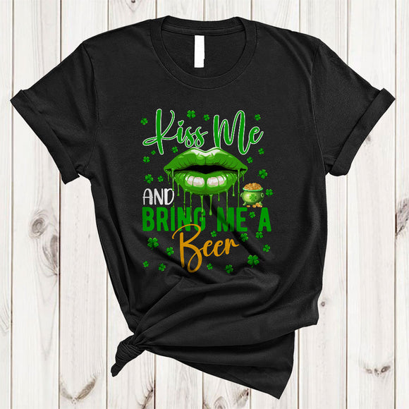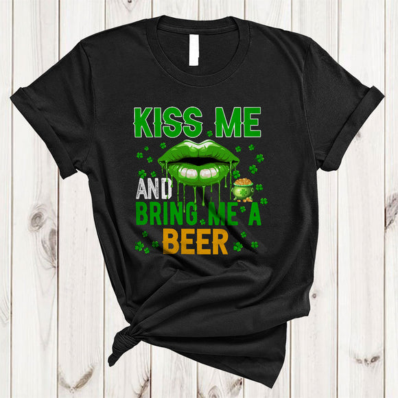 Kiss Me And Bring Me A Beer, Sarcastic St. Patrick's Day Lips, Lucky Shamrock Drinking T-Shirt
