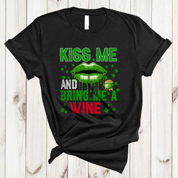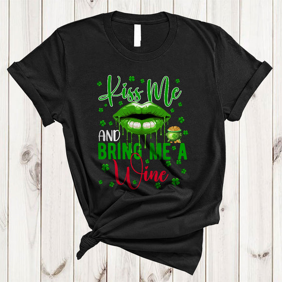 Kiss Me And Bring Me A Wine, Sarcastic St. Patrick's Day Lips, Lucky Shamrock Drinking T-Shirt
