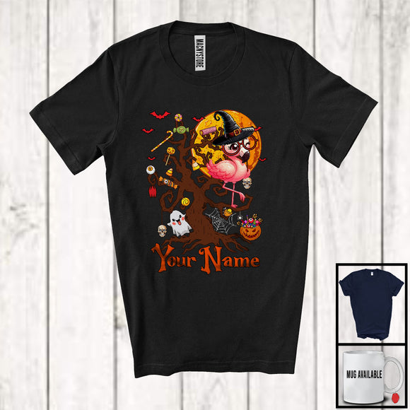 Personalized Flamingo Bird Witch On Tree, Horror Halloween Boo Candy, Custom Name Bird Lover T-Shirt