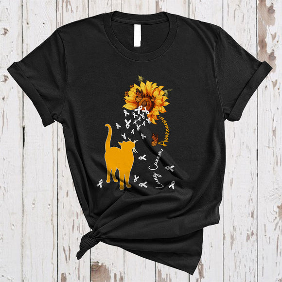 Lung Cancer Awareness, Lovely Cat With Sunflower Butterflies, White Ribbon Family T-Shirt