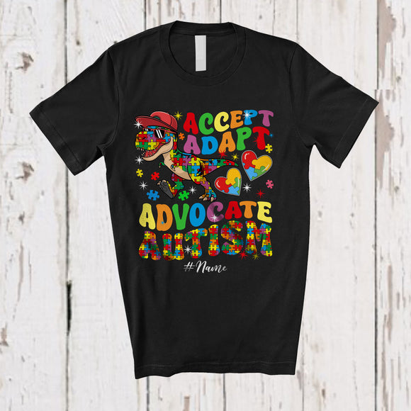 Personalized Accept Adapt Advocate; Lovely Autism Awareness Custom Name Autistic T-Rex T-Shirt
