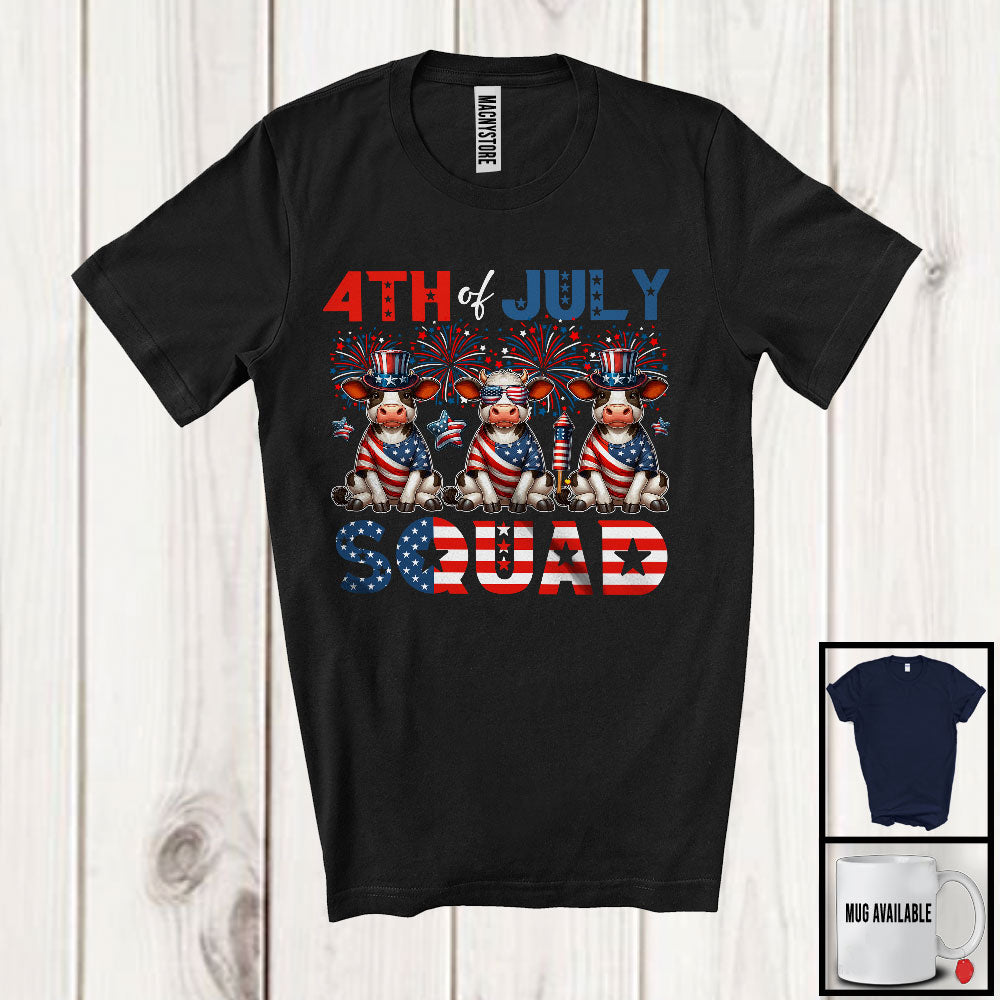 4th Of July Squad, Lovely American Flag Fireworks Three Cows Farmer Animal, Patriotic Group T-Shirt