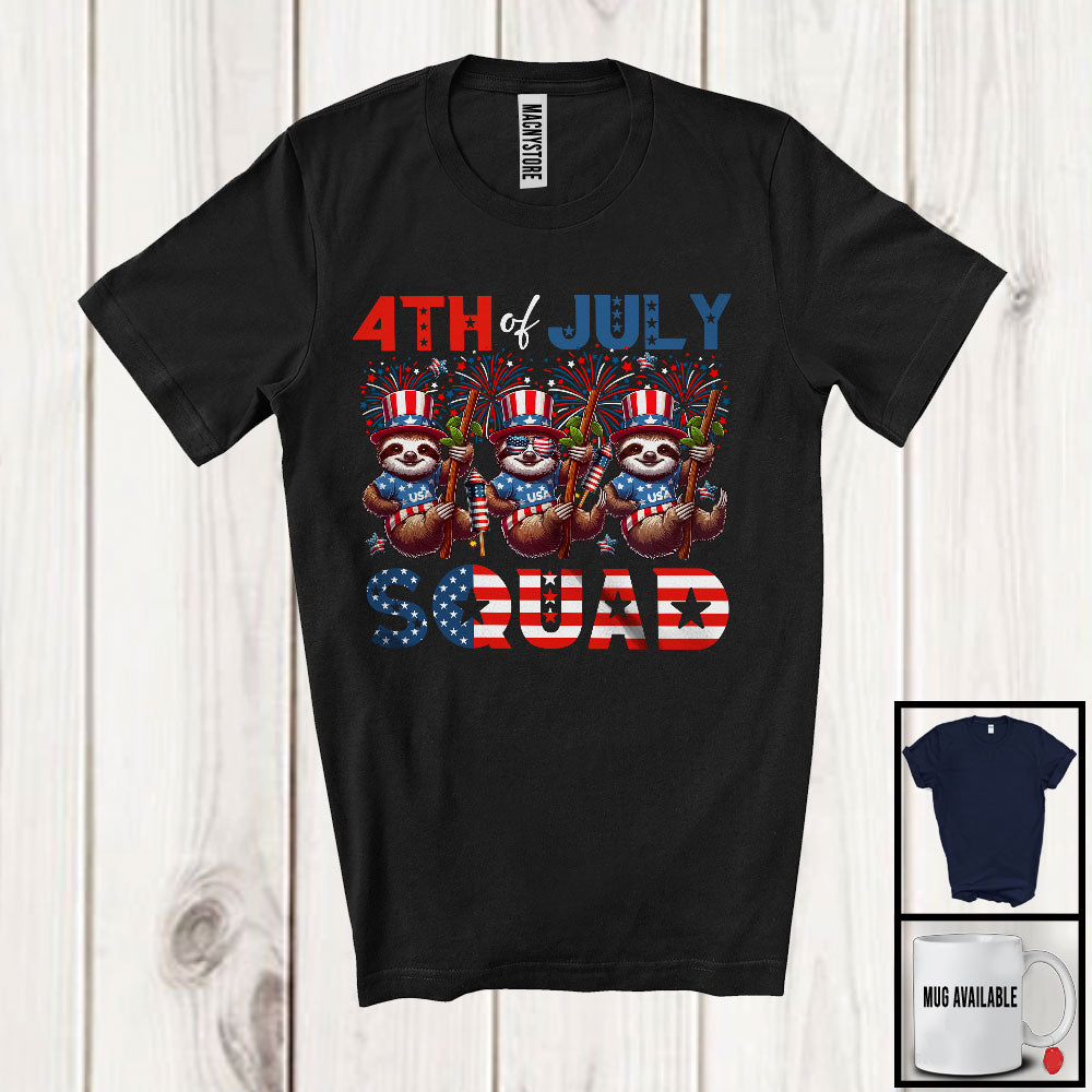 4th Of July Squad, Proud American Flag Three Fireworks Sloths, Wild Animal Patriotic Group T-Shirt. This cotton t-shirt is a durable staple product with a classic fit. One of the most popular items, it has a relaxed style made for everyday and casual wear.