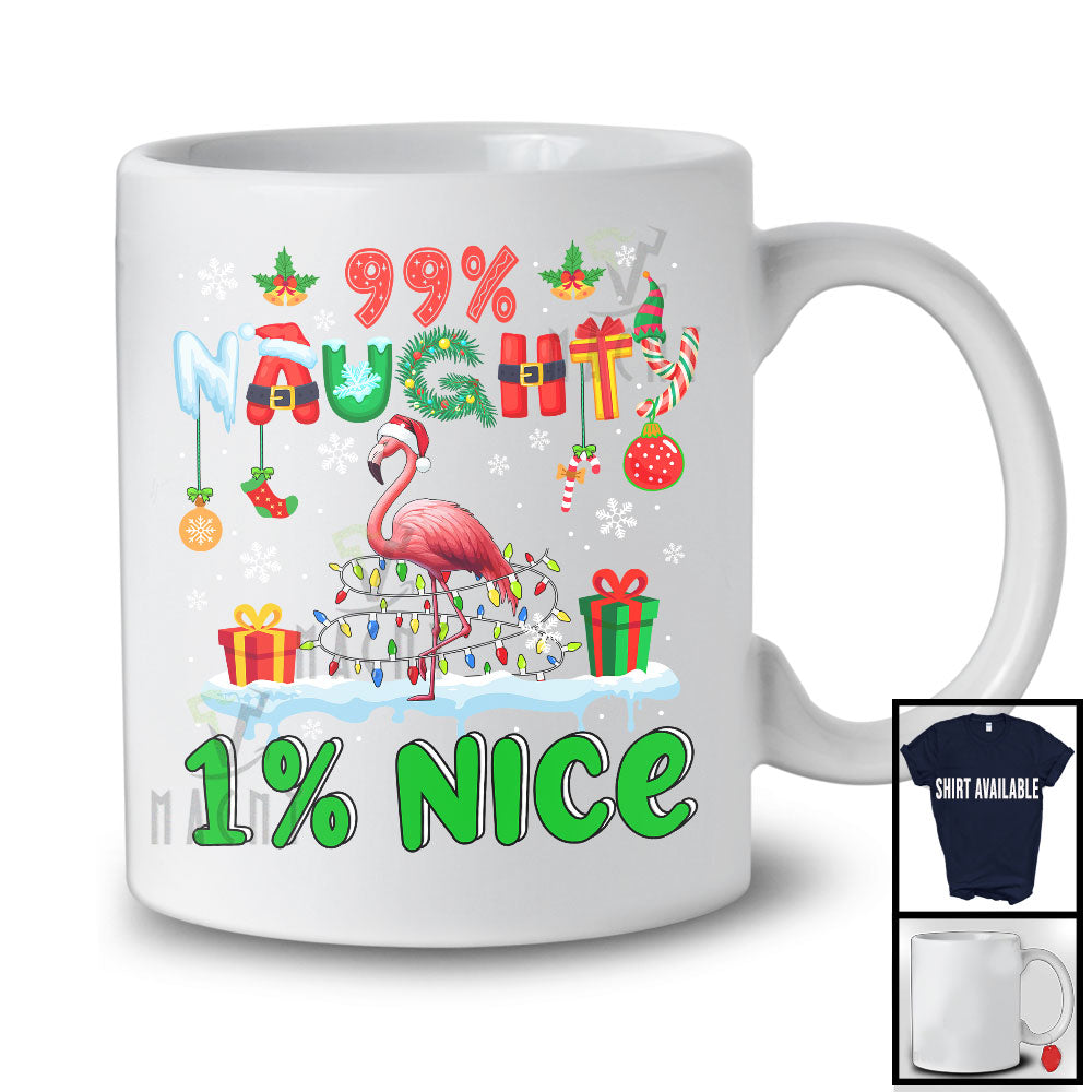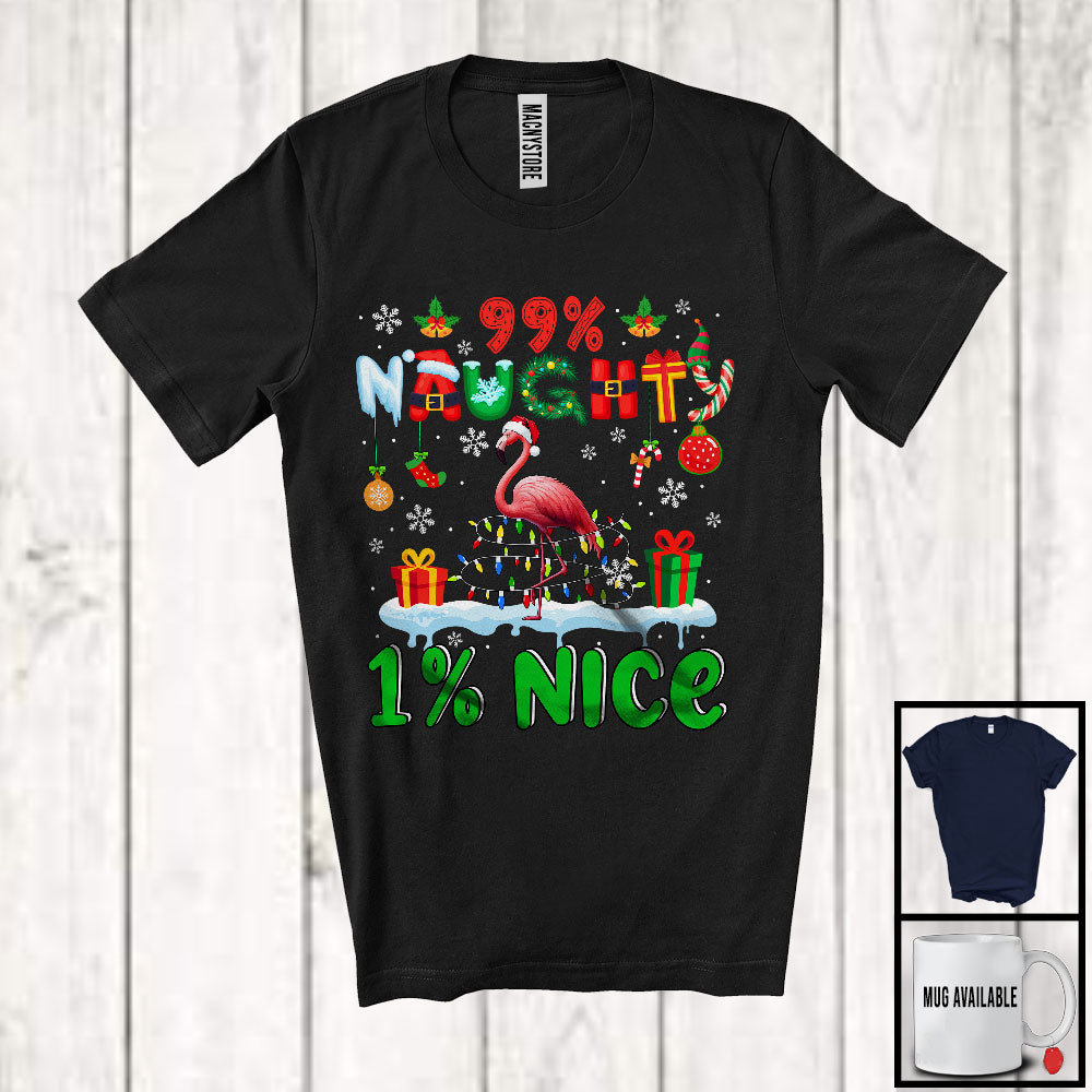 99% Naughty 1% Nice; Awesome Christmas Lights Santa Flamingo Lover; Family Snowing Around T-Shirt. This cotton t-shirt is a durable staple product with a classic fit. One of the most popular items, it has a relaxed style made for everyday and casual wear.