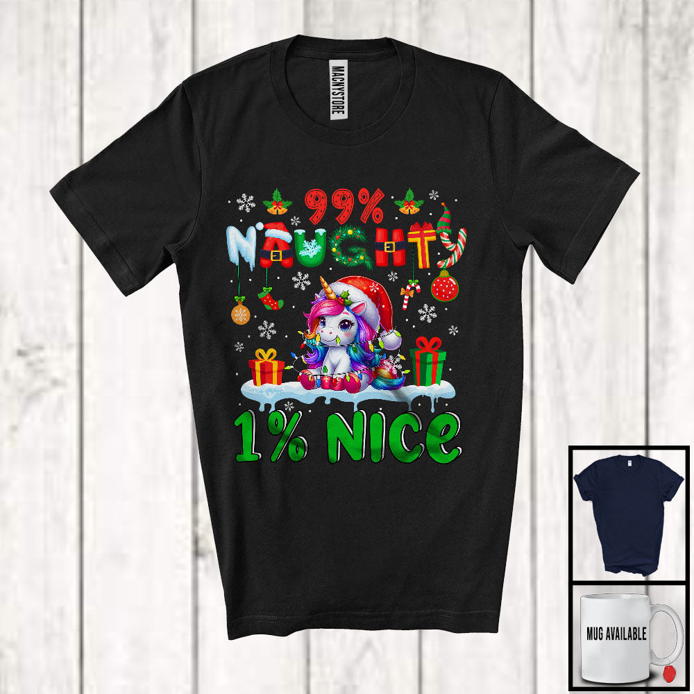 99% Naughty 1% Nice; Awesome Christmas Lights Santa Unicorn Lover; Family Snowing Around T-Shirt. This cotton t-shirt is a durable staple product with a classic fit. One of the most popular items, it has a relaxed style made for everyday and casual wear.