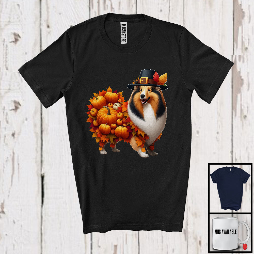new MacnyStore - Autumn Pumpkin Pilgrim Shetland Sheepdog Shape; Happy Thanksgiving Fall Leaves Dog Owner T-Shirt – Macnystore