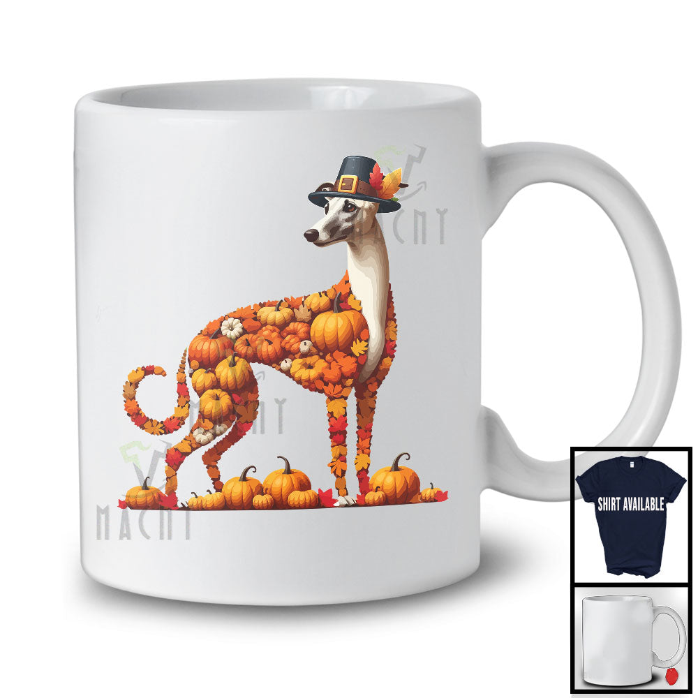 The Autumn Pumpkin Pilgrim Whippet Shape; Wonderful Thanksgiving Fall Leaves Dog Owner T-Shirt destined to impress, and priced at only $12.95, for a limited time.