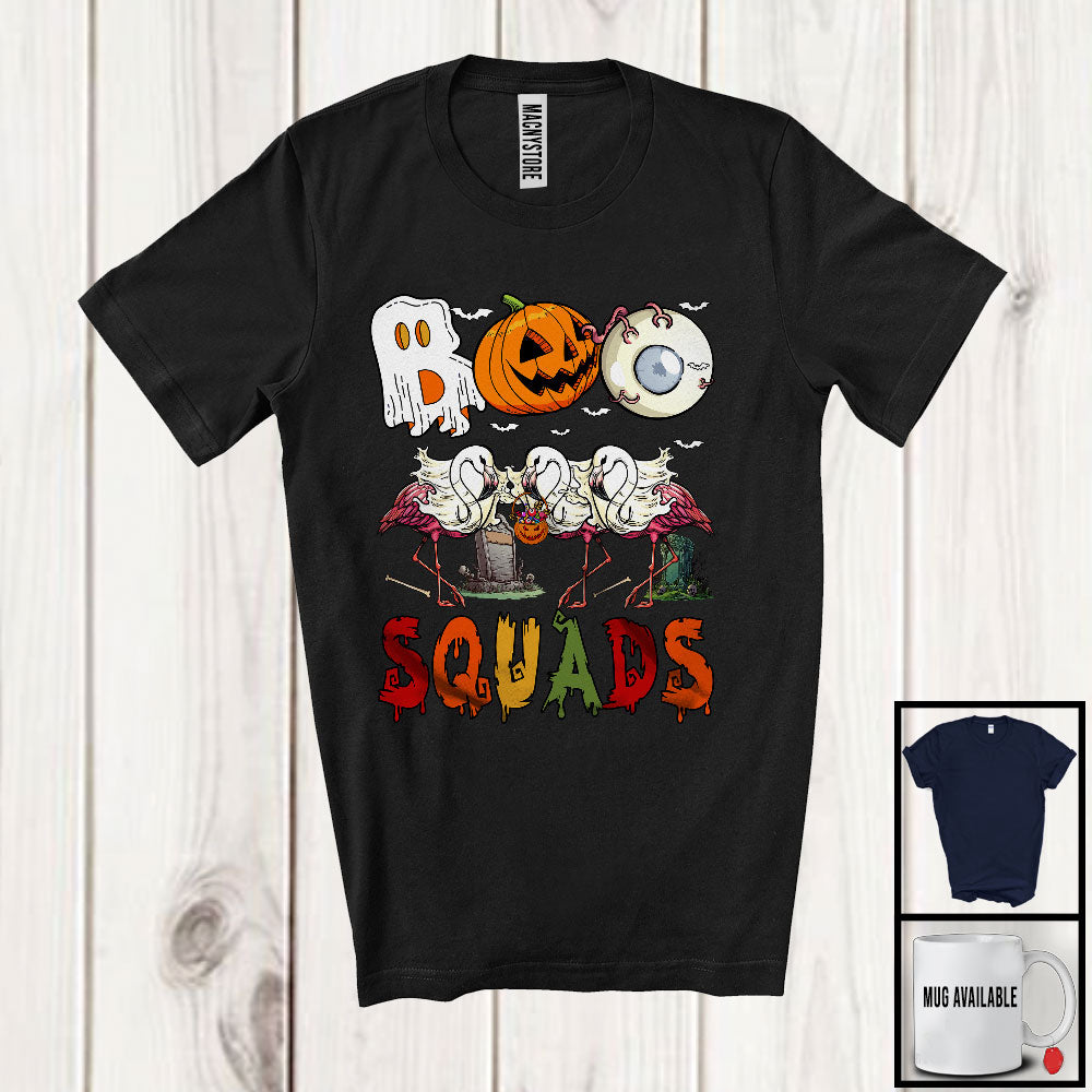 BOO Squads; Awesome Halloween Costume Three Ghost Flamingo Animal; Family Group T-Shirt. This cotton t-shirt is a durable staple product with a classic fit. One of the most popular items, it has a relaxed style made for everyday and casual wear.