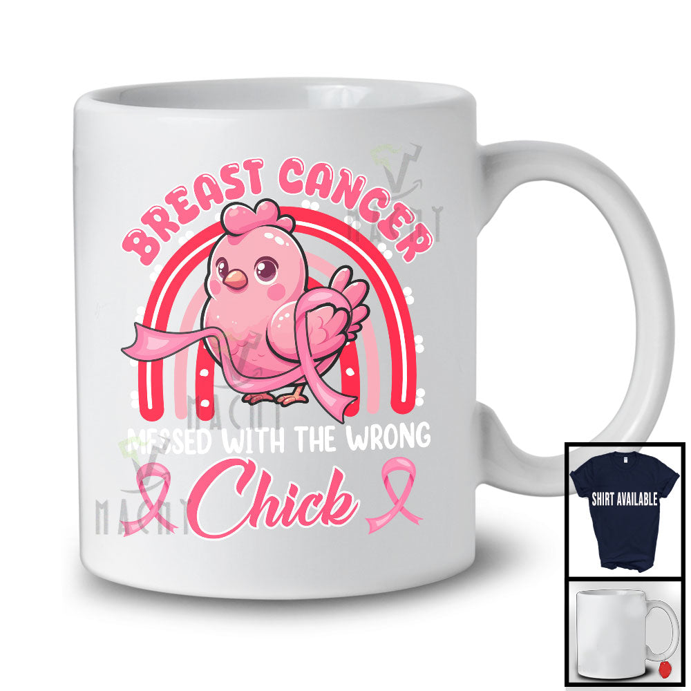 Breast Cancer Messed With The Wrong Chick, Adorable Pink Ribbon Chicken, Rainbow Farm Farmer T-Shirt. This cotton t-shirt is a durable staple product with a classic fit. One of the most popular items, it has a relaxed style made for everyday and casual wear.