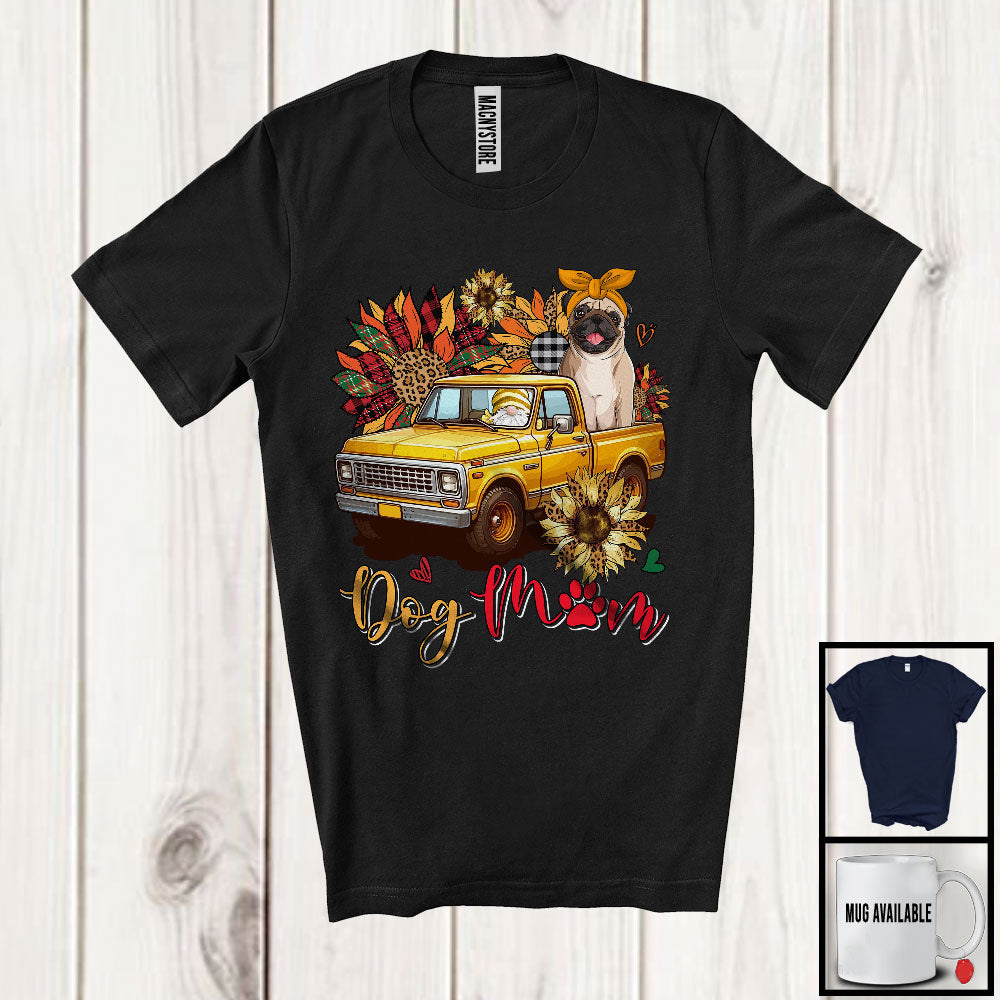 Dog Mom, Happy Mother's Day Gnome Pug On Pickup Truck, Leopard Plaid Sunflowers T-Shirt