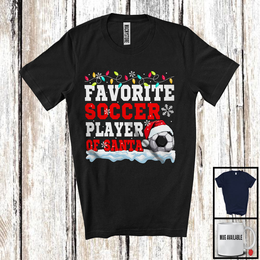 Favorite Soccer Player Of Santa; Proud Christmas Santa Sport Playing Team; X-mas Snowing T-Shirt. This cotton t-shirt is a durable staple product with a classic fit. One of the most popular items, it has a relaxed style made for everyday and casual wear.