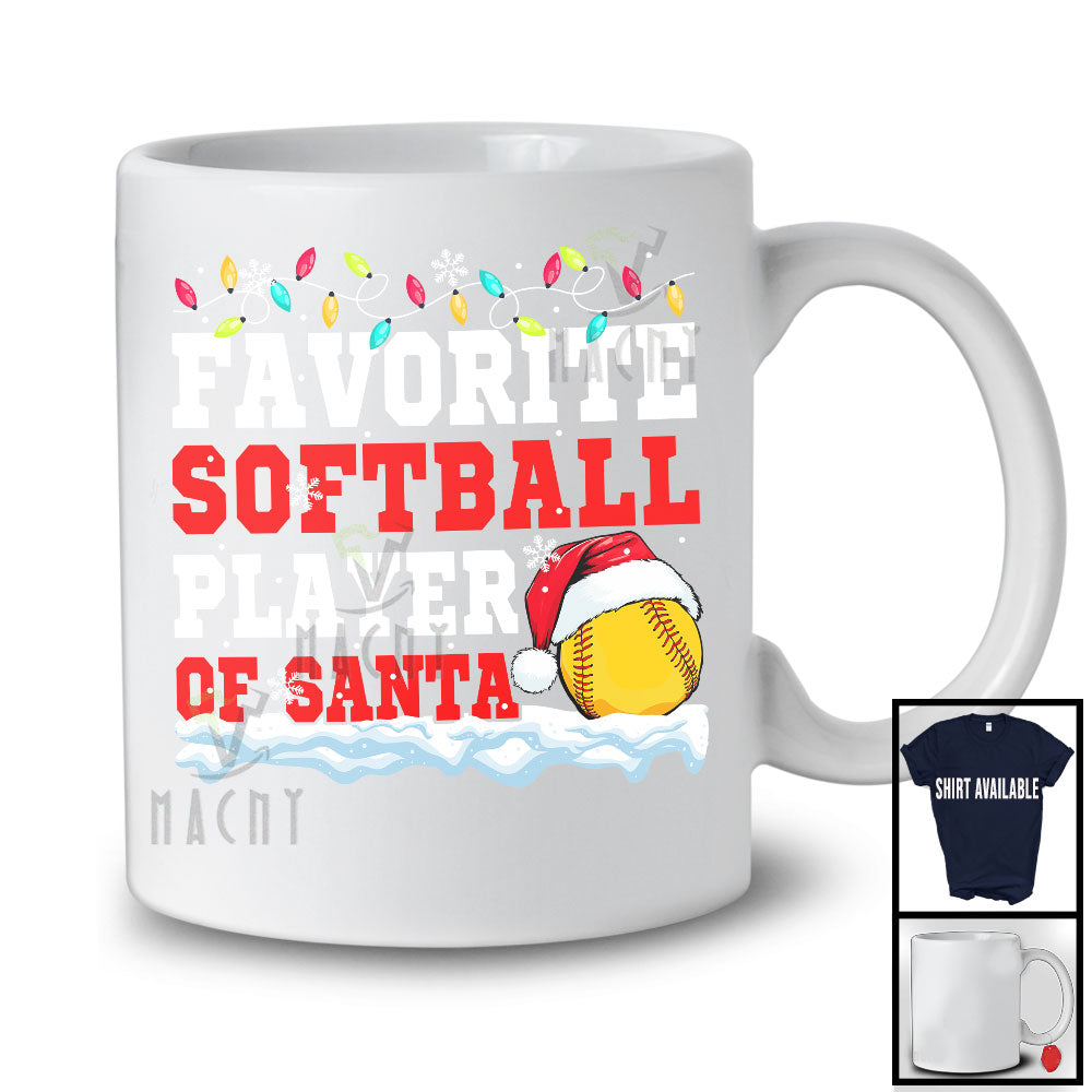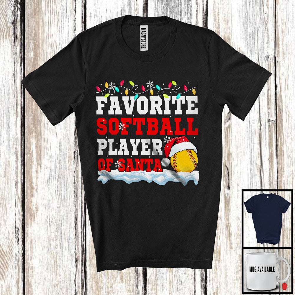 Favorite Softball Player Of Santa; Proud Christmas Santa Sport Playing Team; X-mas Snowing T-Shirt. This cotton t-shirt is a durable staple product with a classic fit. One of the most popular items, it has a relaxed style made for everyday and casual wear.
