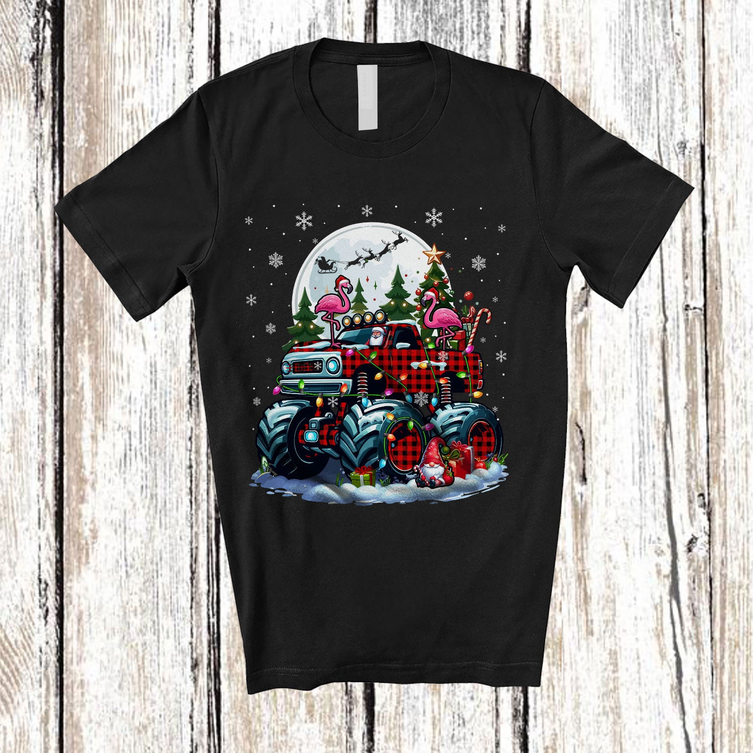 Flamingo On Monster Truck Red Plaid; Lovely Christmas Moon Flamingo Owner; Family Group T-Shirt