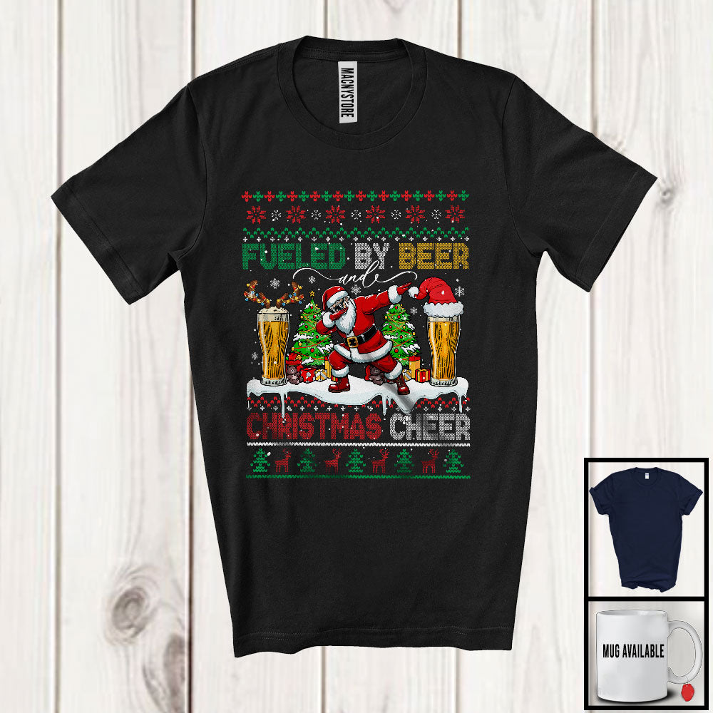 • Fueled By Beer And Christmas Cheer; Joyful Sweater Dabbing Santa Beer; Drinking Drunker T-Shirt. This cotton t-shirt is a durable staple product with a classic fit. One of the most popular items, it has a relaxed style made for everyday and casual wear.
