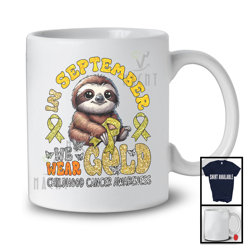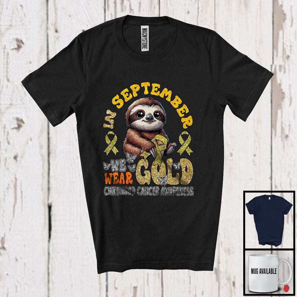 In September We Wear Gold; Lovely Childhood Cancer Awareness Sloth Lover; Gold Ribbon T-Shirt. This cotton t-shirt is a durable staple product with a classic fit. One of the most popular items, it has a relaxed style made for everyday and casual wear.