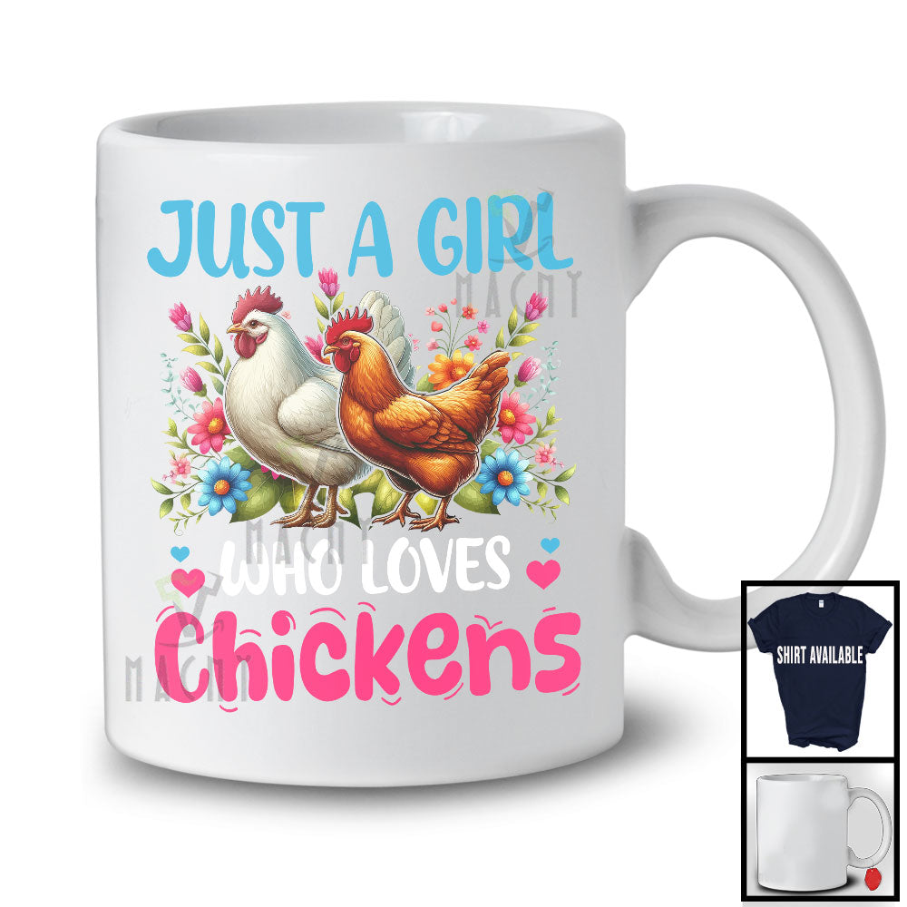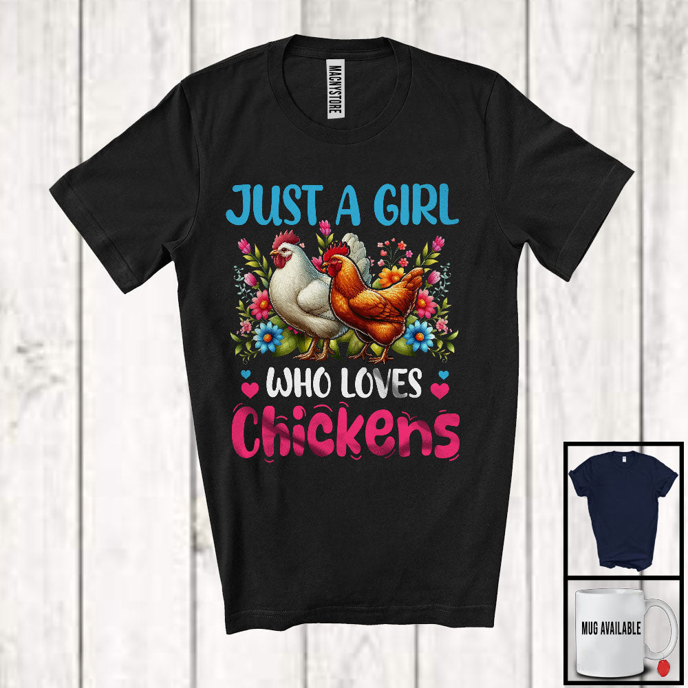 Just A Girl Who Loves Chickens; Adorable Flowers Floral Farm Animals Lover; Farmer Group T-Shirt. This cotton t-shirt is a durable staple product with a classic fit. One of the most popular items, it has a relaxed style made for everyday and casual wear.