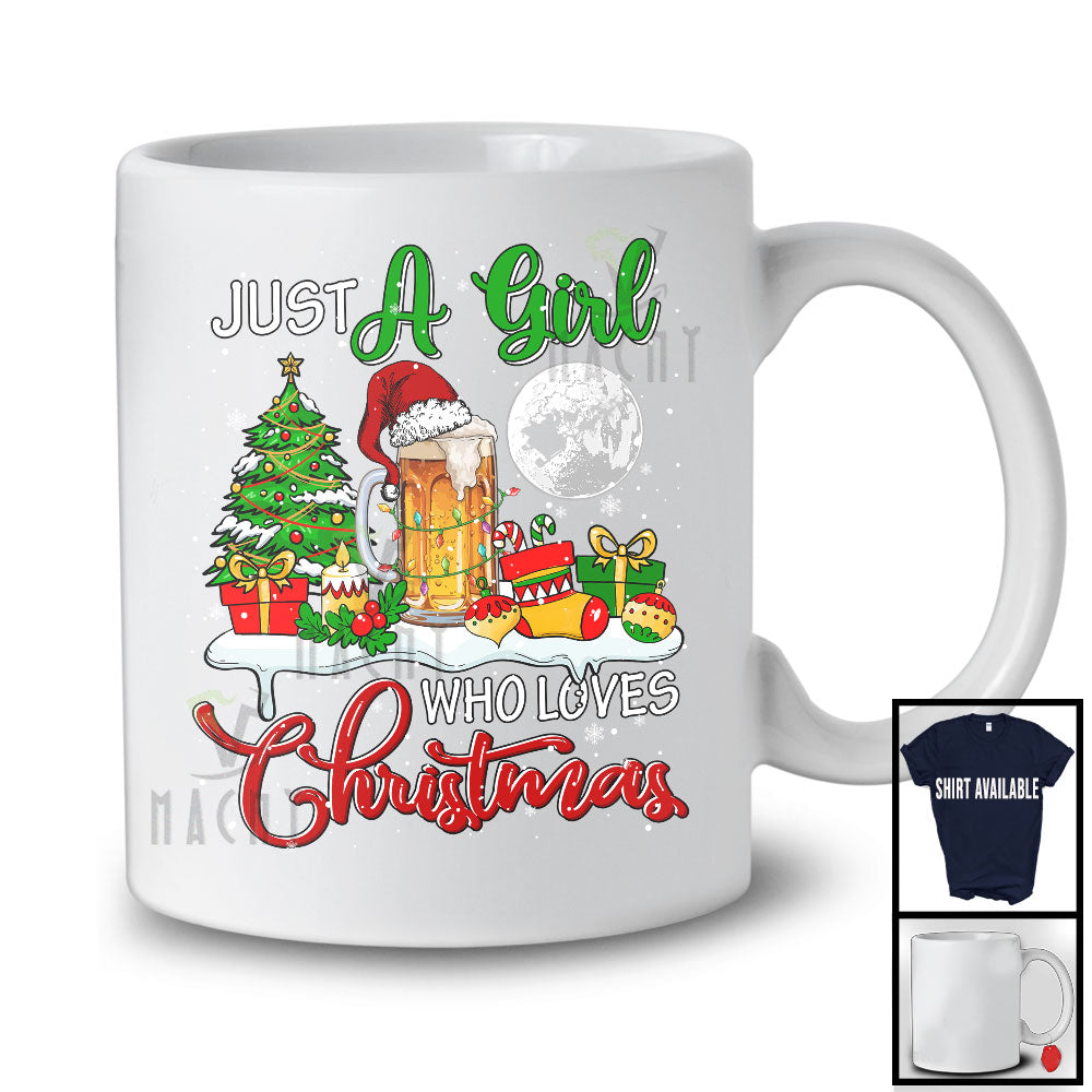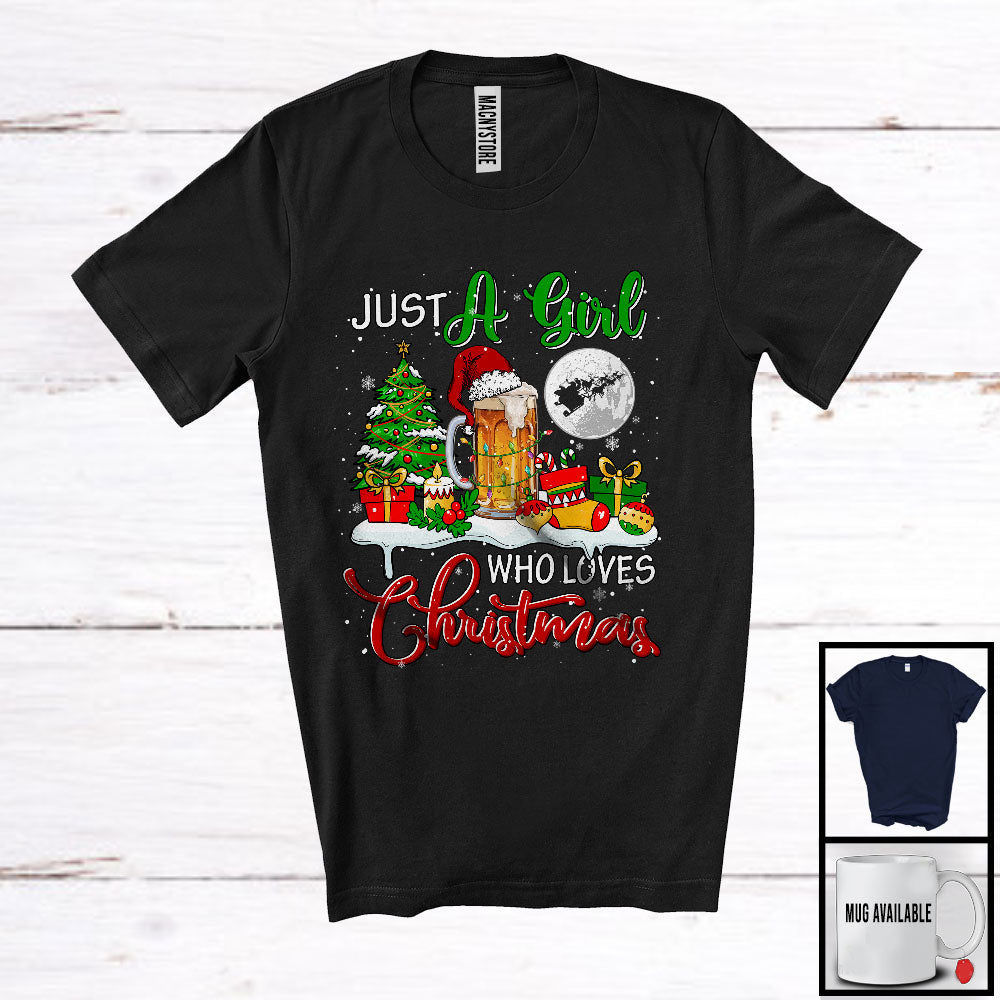Just A Girl Who Loves Christmas; Humorous Santa Beer Snowing Around; Drinking Drunker T-Shirt. This cotton t-shirt is a durable staple product with a classic fit. One of the most popular items, it has a relaxed style made for everyday and casual wear.