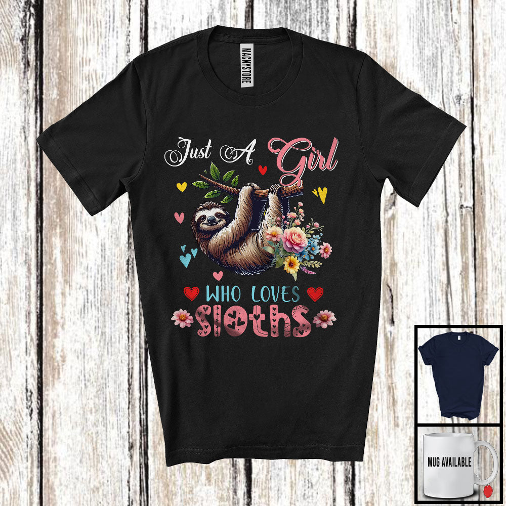 Just A Girl Who Loves Sloths; Adorable Flowers Floral Flowers; Matching Animal Lover T-Shirt. This cotton t-shirt is a durable staple product with a classic fit. One of the most popular items, it has a relaxed style made for everyday and casual wear.