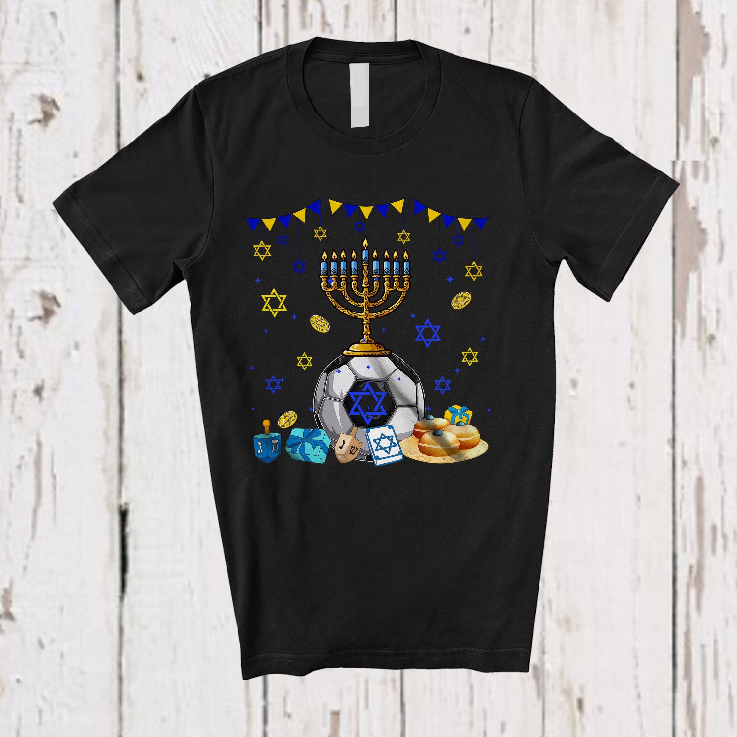 • Menorah With Soccer Equipment; Wonderful Hanukkah Family Soccer Player Playing; Sport Team T-Shirt. This cotton t-shirt is a durable staple product with a classic fit. One of the most popular items, it has a relaxed style made for everyday and casual wear.